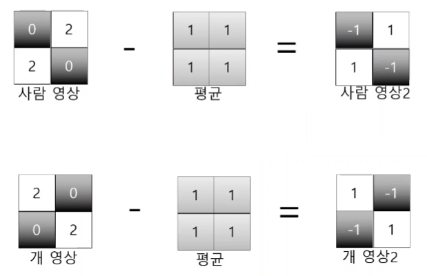 사람과 강아지의 영상에서 벡터를 구하고, 전처리로 평균값을 뺀다.
