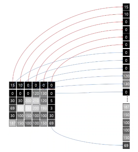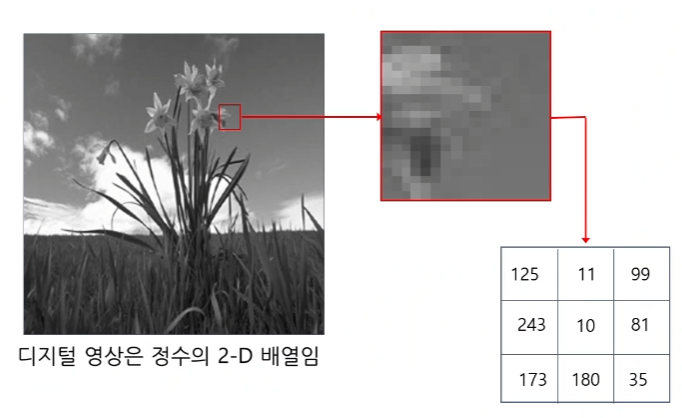 흑백 영상은 화소 하나씩이 하나의 값이 된다.